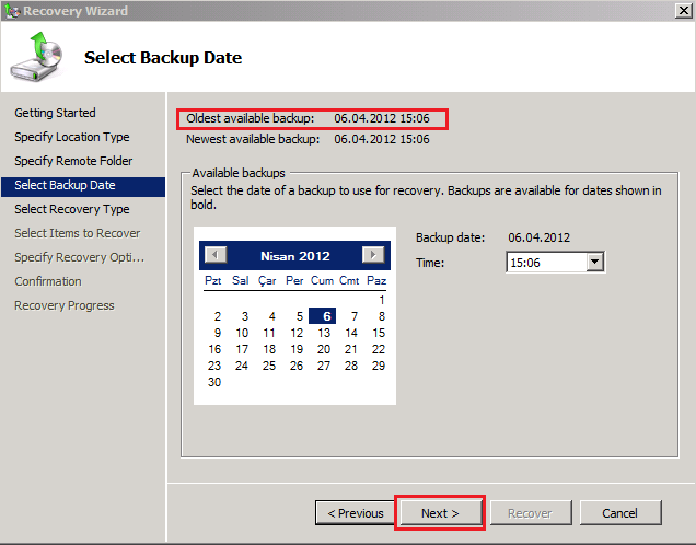 Aldığınız en son backupları yukarıdaki takvimden de görebilirsiniz.Biz şu durumda tek backup aldığımız için aldığımız son backupı seçip devam ediyoruz.