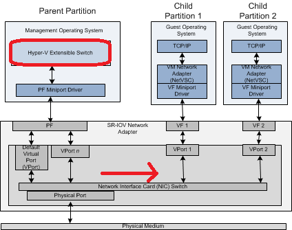 Fiziksel makinelere takılan bu PCI device lar ile sanal makineler arasındaki data akışına fiziksel makine (Hyper-V Extensible Switch) dahil olmaz dolayısıyla fiziksel makinenin CPU suna yük binmez. Data akışı doğrudan PCI device ve sanal makineler arasında olur.