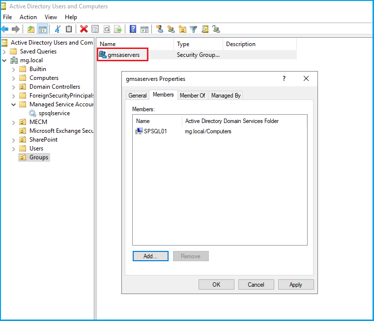 Önce bir grup oluşturuyorum. Bu gruba (gmsaservers) üye bilgisayar hesabı ya da hesapları bu service hesabını kullanabilecek. Bizim yapıda bu gruba sadece SPSQL01 sunucusu üye durumda , çünkü servis hesabımız sadece bu sunucuda çalışacak. SQL yapımızı yedekli yapsaydık sunucu sayımız en az 2 ye çıkacağı için 2 sunucuyu da üye yapmak durumunda kalacaktık. Bu yöntemi güvenli hale getiren durum ise bu hesabın gruba üye olmayan başka sistemler tarafından kullanılamaması.