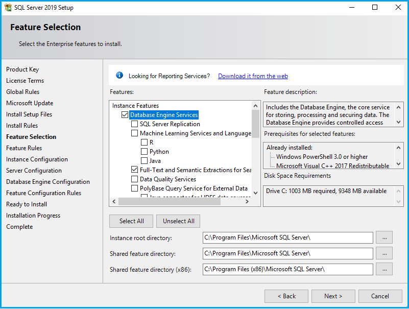 Burada “Database Engine Service” ve SharPoint servisinin genel olarak kullandığı “Full Text …” özelliklerini seçiyoruz.