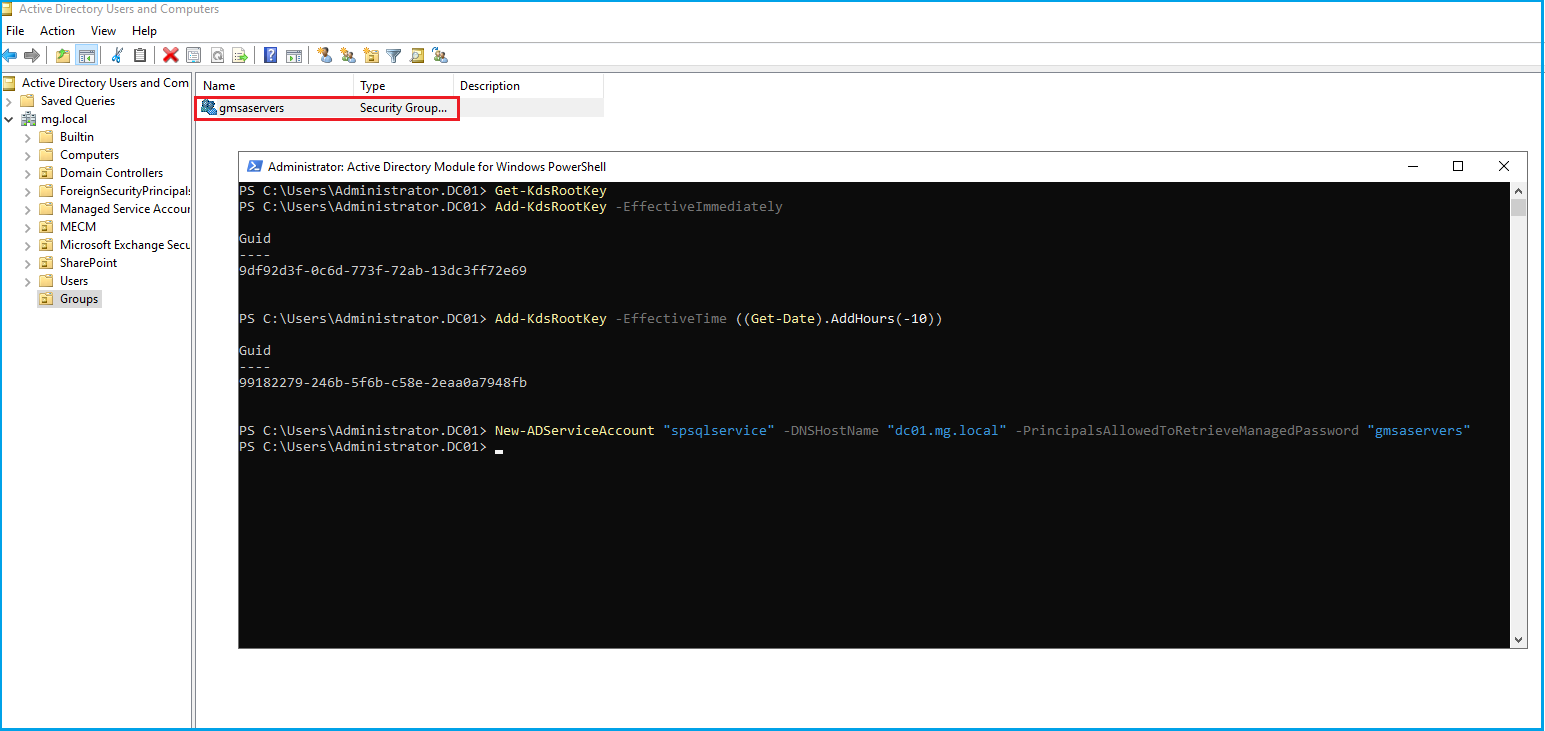 New-ADServiceAccount "spsqlservice" -DNSHostName "spsqlservice.mg.local" -PrincipalsAllowedToRetrieveManagedPassword "gmsaservers"