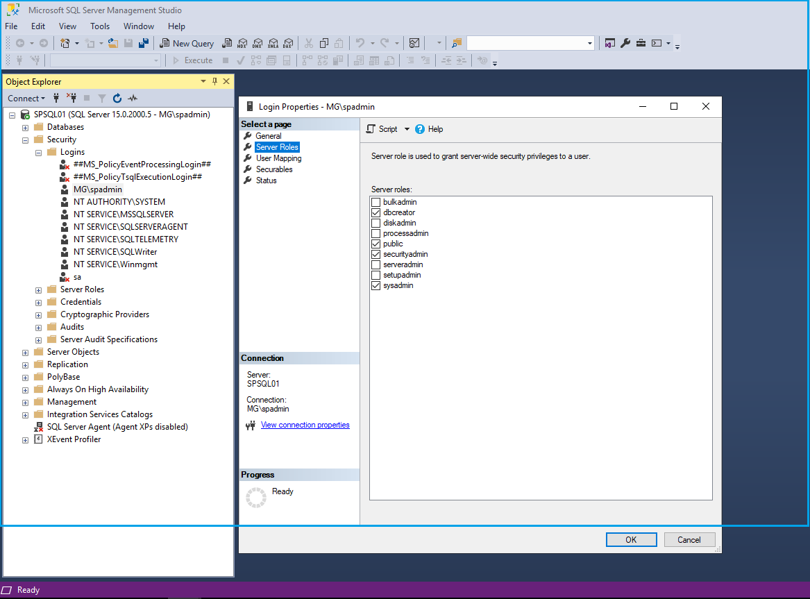 “spadmin” hesabına yukarıdaki gibi “dbcreator” ve “security admin” rollerini ekliyorum. Çünkü bu hesap ile birazdan bu sunucuda bir veritabanı create edeceğiz.
